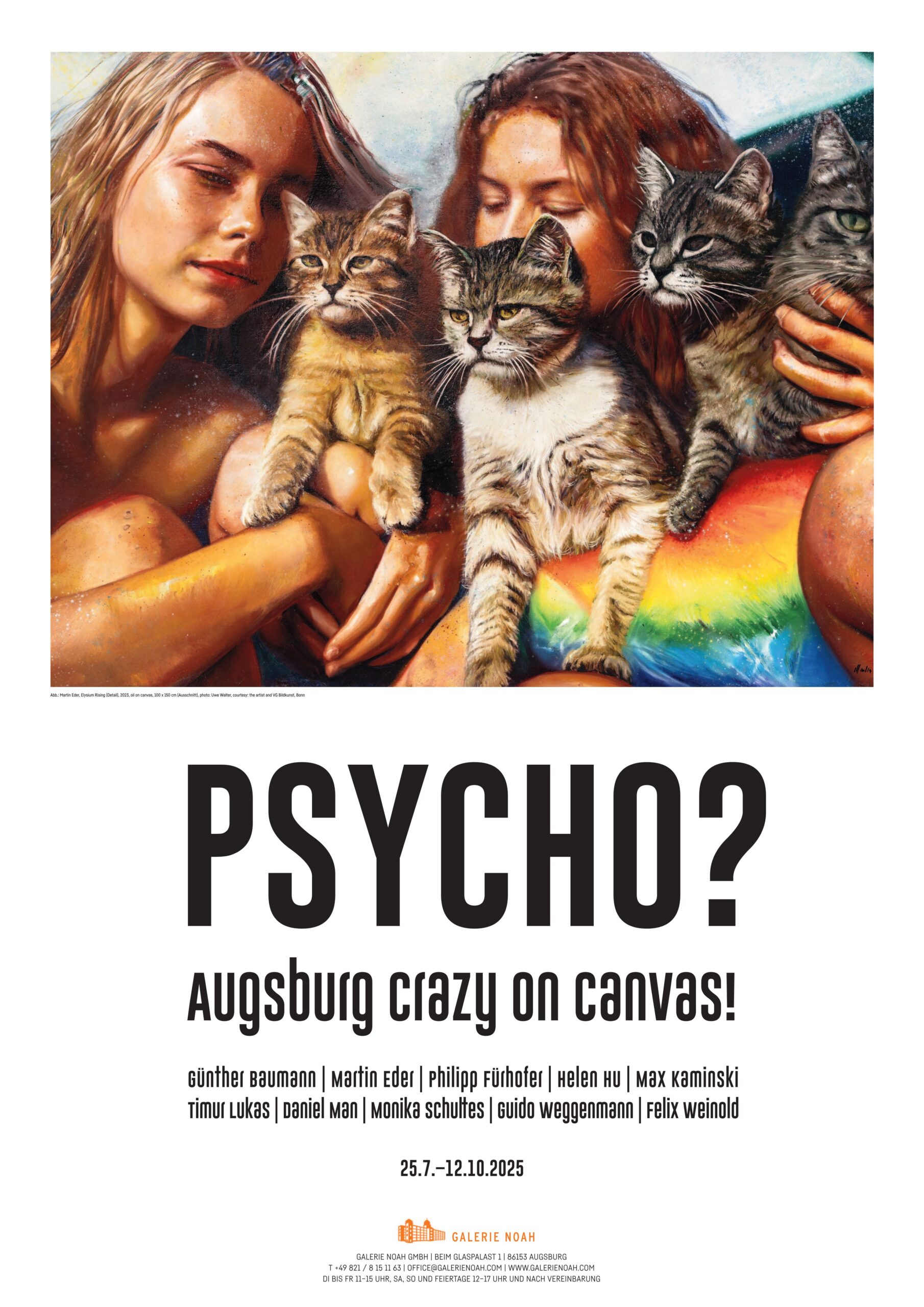 Wir, die GALERIE NOAH im Augsburger Glaspalast, zeichnen hier ein überwiegend düsteres, zugleich auch wunderschönes Bild, voller Pathos und Schwermut, ein Bild, bestehend aus 40 Arbeiten meist der letzten Jahre von zehn vielversprechenden Künstlern aus Augsburg, die sich viel mit Vanitas, Vergänglichkeit, Vergehen beschäftigen, mit Vereinsamung, mit trister Provokation, mit tief-trübem Fischen im selig Filigranen, auf der Suche nach Sinn, Sinnhaftig-, wie Sinnlosigkeit; die das Wahre, Gute und Schöne allerhöchstens kurz aufflackern lassen, sich kurz daran ergötzen, um wieder in Resignation zu versinken. Crazy, verrückte, ja, psychopathische, also, von Ängsten und vermeintlichen Zwängen, auch antisozialen Verschwörungstheorien motivierte Motive, Kompositionen könnte man, so man wollte, deuten. Sind Krieg, Klimakrise und schwindende Konjunktur, Sorge um die Zukunft Schuld daran? Oder, die Heimat Augsburg, Bayerisch-Schwaben, Bayern? Oder aber, sind wir nicht alle ein bisschen „Psycho“? Selbstironisch, teils sarkastisch, oft unverschämt unmittelbar versuchen wir all diesen mysteriösen Fragestellungen in dieser unserer aktuellen Ausstellung auf den Grund zu gehen.